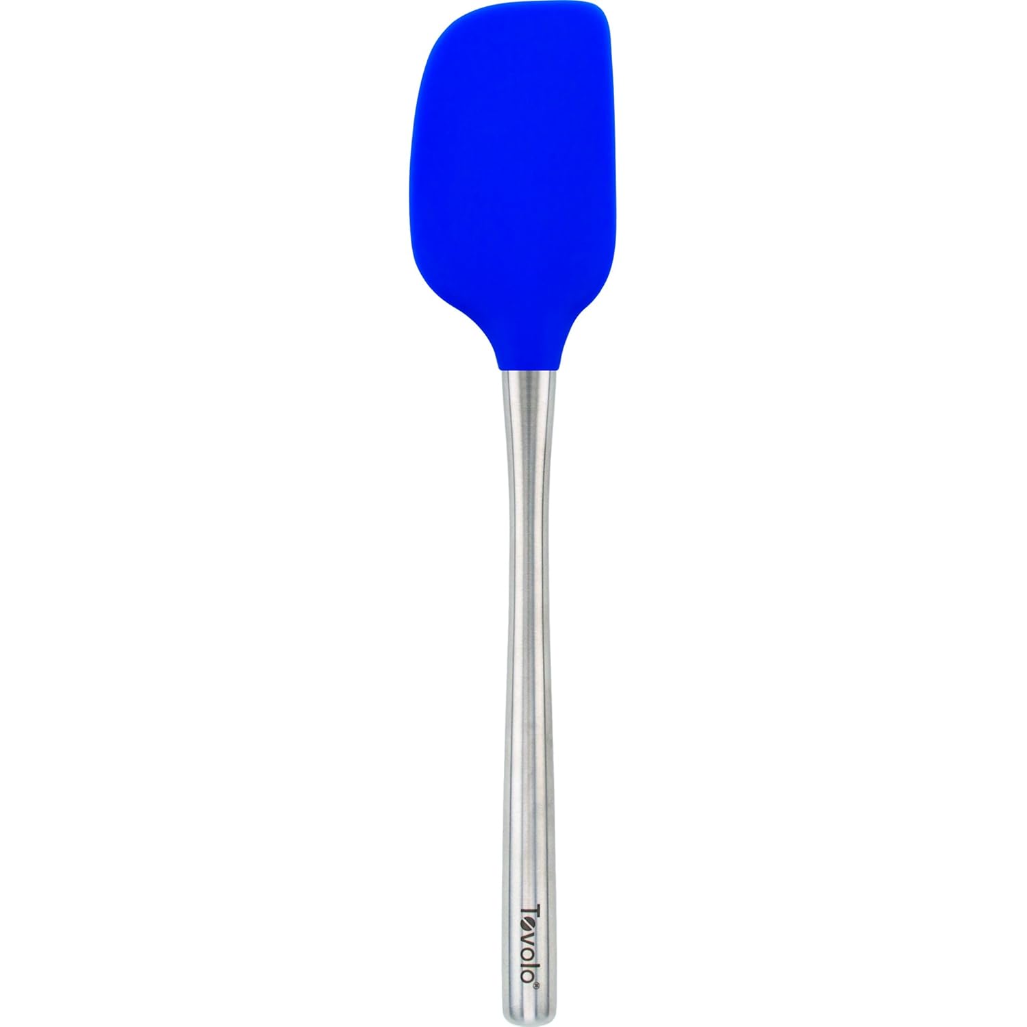 A 'Spoonula' is half spoon and half spatula, and this versatile style spatula is great for mixing, folding, serving and scraping. It's flexible for scraping and serving, but curved for mixing and folding.This mini spatula is designed specifically for scraping jars so you can easily spread jams or jellies, peanut butter, mayonnaise and other condiments.the Tovolo Flex-Core Stainless Steel Handled Spatula - Stratus Blue The small spatula fits easily into the jar to scoop it out and works wonderfully for spreading too. Great for scooping out every last drop of delicious jam, jelly and peanut butter.The lifted edges of the spoonula allow you to easily scrape the sides of your mixing bowl and scoop batter into cupcake pans or dollop icing onto your cake for frosting.All of the Wilton silicone spatulas are high-heat resistant, you can use them for making light and fluffy scrambled eggs because hey won't melt or scrape the pan.- A good assistant for whisking eggs, icing sugar mixture and melted chocolate fresh cream enable your household more easier and effective.- From beating a single egg to mixing a cake batter the sturdy and efficient classic whisk has multiple wires for adding volume and quickly smoothing lumps from mixtures.- This stainless steel whisk set can be very handy in any kitchen. Set includes 3 different sizes so you can pick the right whisk for the right task.- Hanging loop at the end of the handle makes it storage easily.Tovolo Flex-Core Stainless Steel Handled Spatula - Stratus Blue is best for youIntroducing Flex-Core, the new standard in spatulas. We've added a nylon core to the head of our silicone spatula, creating a spatula rigid enough to tackle heavy mixing jobs, yet still flexible on the edges to give you the perfect scrape. Tovolo's Flex-Core Stainless Steel Handled Spatulas have an ergonomically shaped handle allowing for a comfortable grip; making them perfect for mixing, folding, serving, spreading, scraping and flipping. The completely smooth surface allows for even spreading while the edges are tapered to a sharp point to scrape sides clean. The square corners allow this spatula to fit into tight spots and the angled head is perfect for easy scooping. These sleek, stylish stainless steel handled spatulas will look amazing in any kitchen, match any decor and are dishwasher safe.