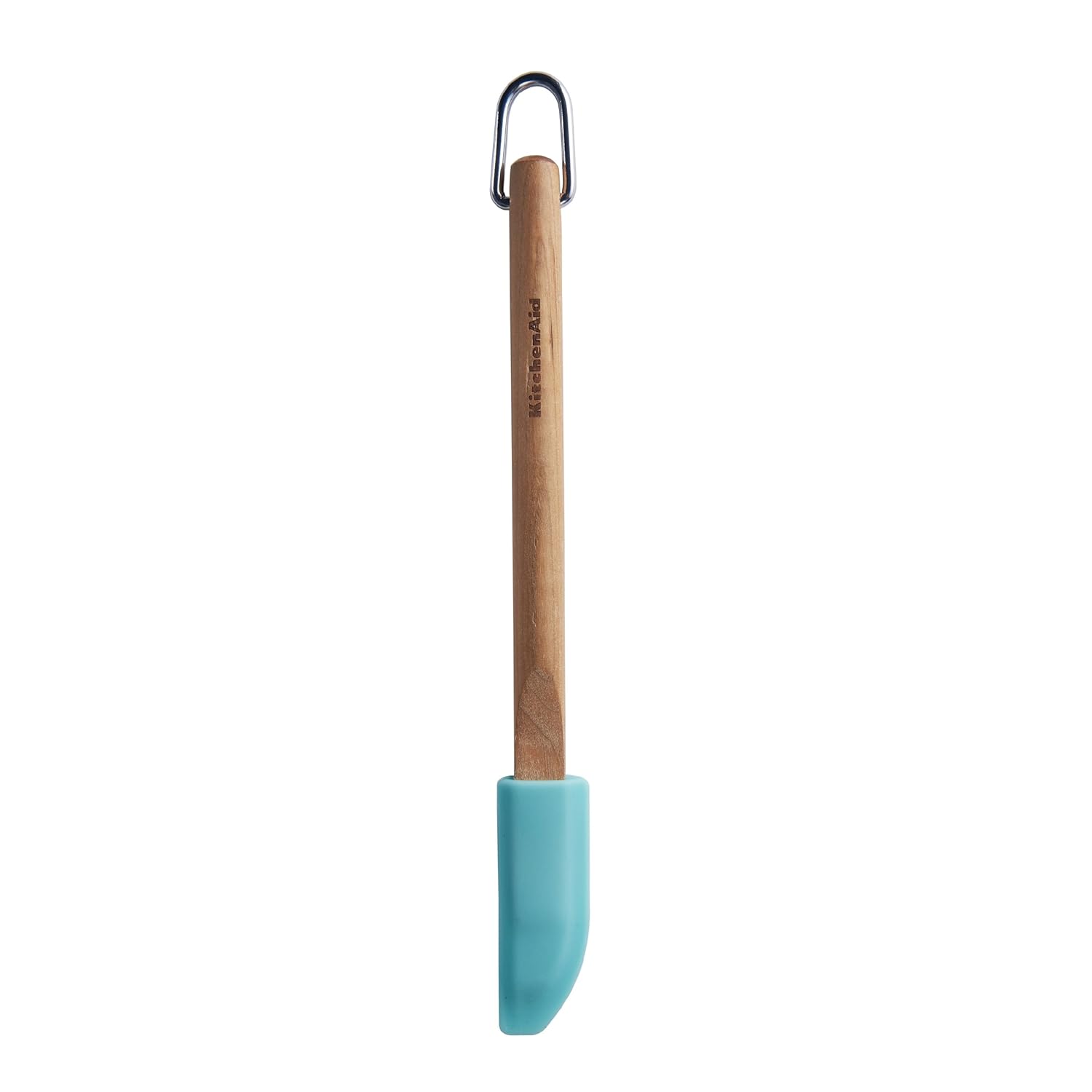 • The KitchenAid Gourmet Cherry Wood Handle Silicone Jar Spatula, Aqua Sky is a