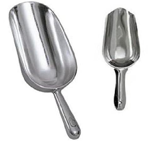 12 and 6 Ounce Utility Scoops is best for you6 ounce flattened scoop is all stainless steel and the rounded 12 ounce scoop is aluminum. 2 convenient sizes in one pack for numerous chores around the kitchen or outdoors. Scoop baking ingredients, nuts, ice, or outside for dog food, chicken or livestock grain.