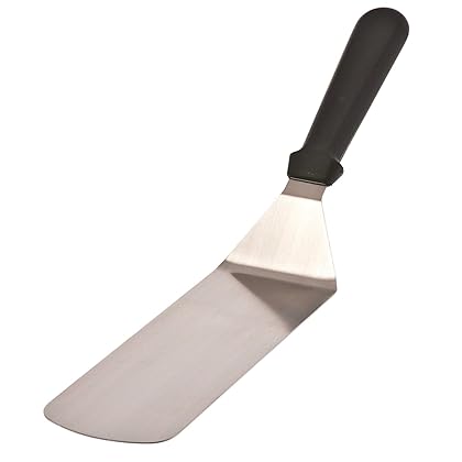 Browne (PC1280) 15" Stainless Steel Solid Turner is best for youThis solid turner is flexible and its blade is made of stainless steel material. It has black ABS plastic handle that is securely attached to a stainless steel blade. Its handle allows for a comfortable grip while also keeping hands a safe distance away from a burner, griddle or other cooking source. This solid turner has 1.0-mm thickness. Blade measures 8-inch length by 2-3/4-inch width and over all length 14-1/2-inch.