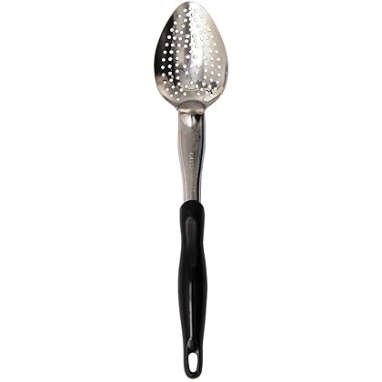Vollrath (64132) 13-13/16" Heavy-Duty Stainless Steel Perforated Basting Spoon is best for youThis heavy-duty perforated basting spoon comes with black ergonomic handle which is comfortable and reduces hand fatigue. Shaft and bowl are made of heavy-gauge stainless steel material which is corrosion resistant. High temperature patented nylon handle is heat resistant to 450 degree Fahrenheit (232 degree Celsius). Handles equipped with Agion antimicrobial protection. Textured surface on handle prevents slippage while in use. NSF certified. Built-in stopper notch prevents spoon from sliding into food product. Unique bowl shape with contoured end fits corner of pans, reducing food waste and maximizing serving efficiencies. Measures 13-13/16-inch length.
