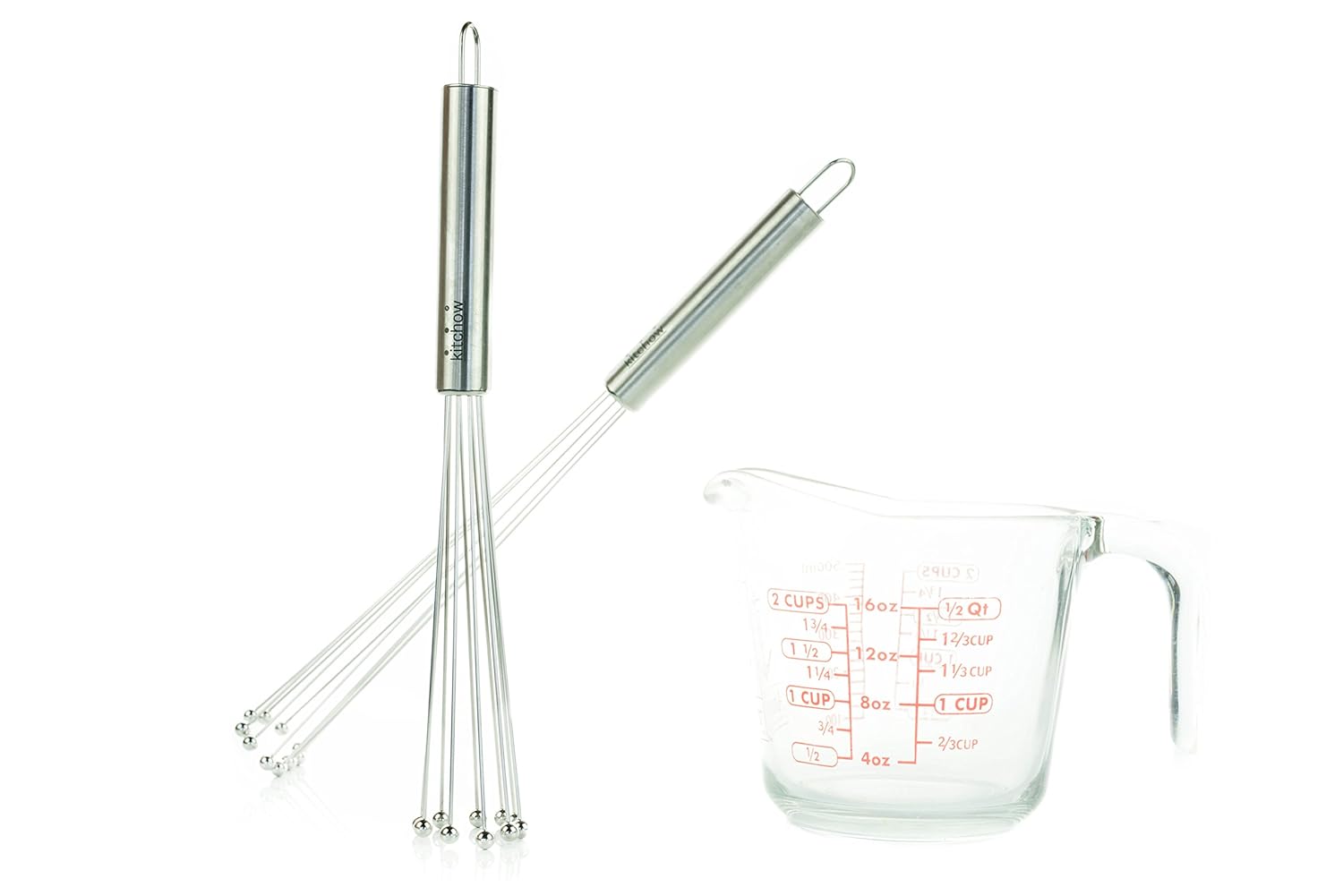 Perfect for any kitchen, this 3-piece silicone whisk set will help you with all your cooking needs. They are non-stick and will make your life much easier as once you are done with cooking you can throw them in the dishwasher for easy cleaning every time. Included in this set Blue Whisk: 12-inch, Red Whisk: 10-inch,Green Whisk: 8.5-inch, 100% Lifetime Money-Back Guarantee. Don't settle for an inferior whisk set when you can choose the best set of 3 whisks selling today. Three sizes allow for you to cook a variety of meals with ease. The stainless steel ends allow for easy hanging on any hook in your kitchen, allowing for easy storage.the Stainless Steel Ball Whisks (Set of 2) Hand Mixer & Kitchen Whisk - Blending, Whisking & Beating - Egg Beater & Whip Cream Whipper - Premium Kitchen A These super durable silicone spatulas will quickly become your go-to tools for mixing, folding, scraping, cooking and even serving. High-heat resistant silicone heads (up to 500 degrees), so they're not just for mixing.The silicone head is firm enough makes it easily to fold dough, yet flexible enough for making fluffy scrambled eggs.The clear acrylic handle is hourglass shaped to fit comfortably in your hand. Silicone head detaches for easy cleaning and both pieces are dishwasher safe. Plus, they're stain-resistant to stay looking like new longer.This all-purpose spatula is perfect for mixing batter, folding dough and scraping the mixing bowl. It's also commonly used to make fluffy and delicious scrambled eggs without damaging the pan.Stainless Steel Ball Whisks (Set of 2) Hand Mixer & Kitchen Whisk - Blending, Whisking & Beating - Egg Beater & Whip Cream Whipper - Premium Kitchen A is best for youMaking food preparation easier and more fun with a stainless steel ball whisk from Kitchow.