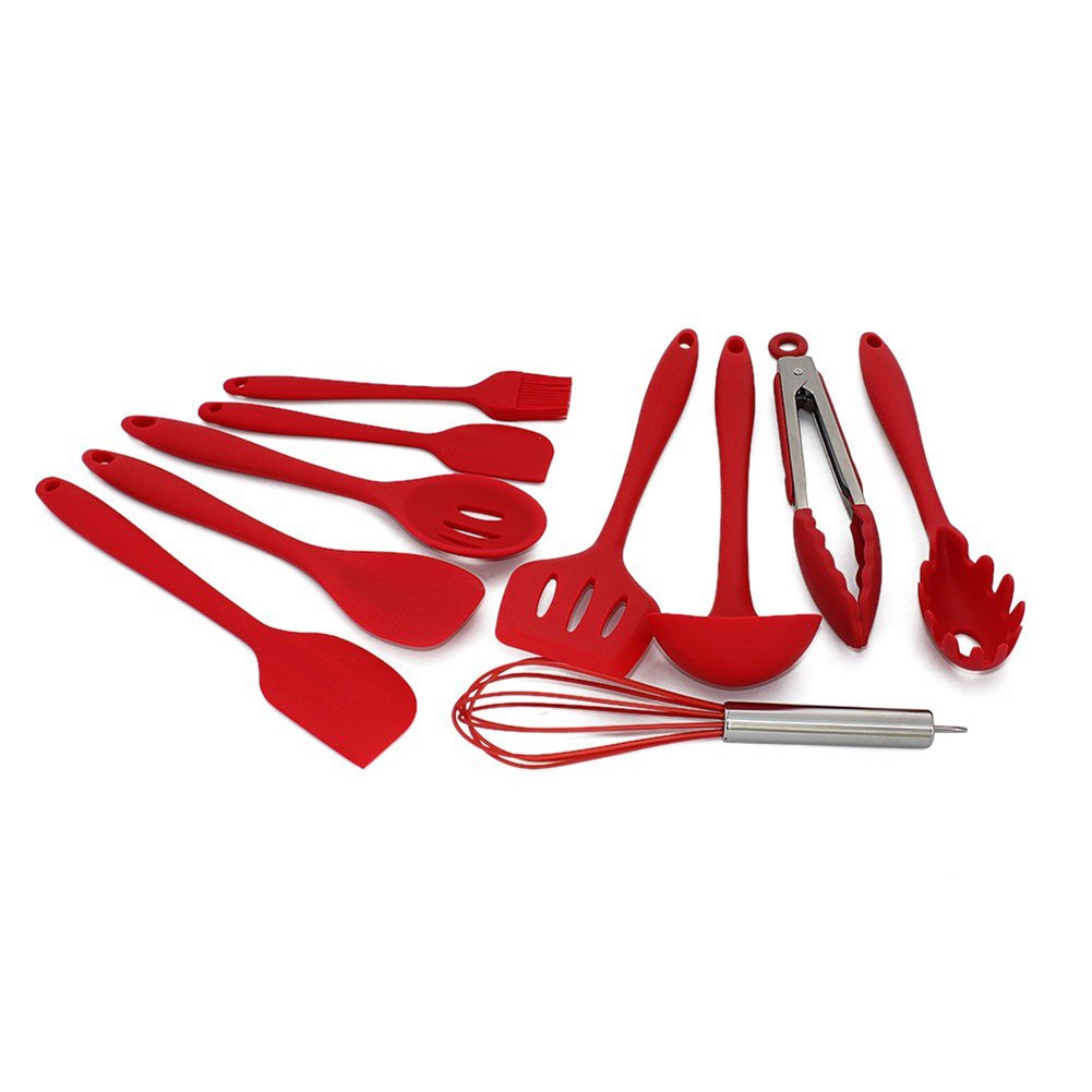 • The Feiuruhf 10 Pieces Silicone Cooking Utensils Sets Non-stick Heat Resistant Hygienic Kitchen Gadgets with Spoonula, brush, whisk,large and small spatula,ladle,slotted turner and spoon,tongs,pasta fork is a