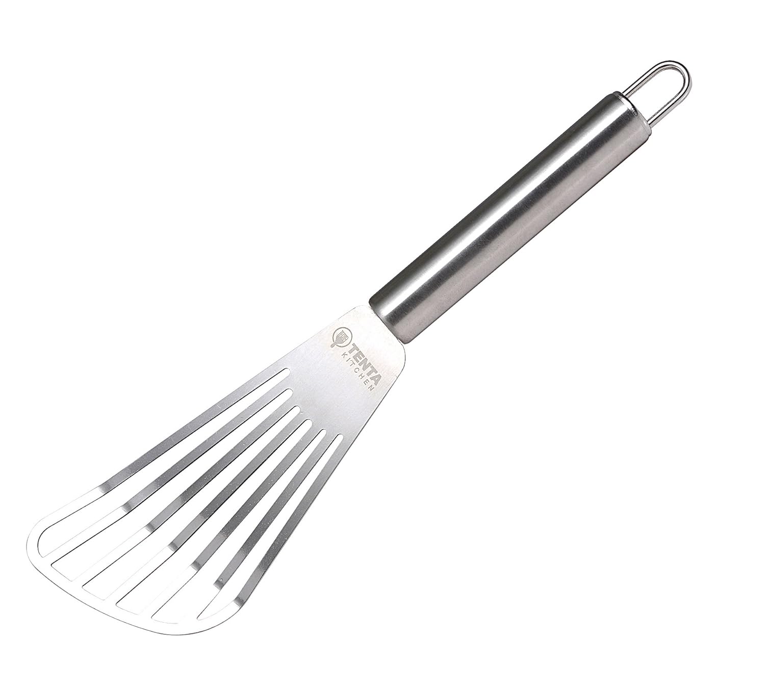 • The Tenta Kitchen Stainless Steel Fish Turner, for Fish, Egg, Meat, Dumpling Frying is a