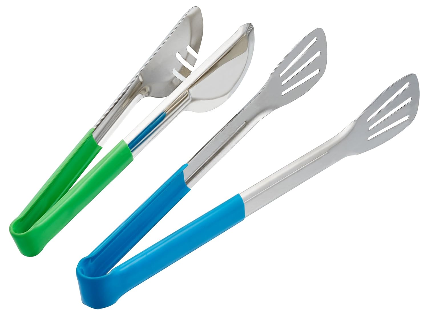 • The TeamFar Barbecue BBQ Tong & Salad Tong, Kitchen Cooking Serving Tongs, Stainless Steel, Solid & Long, Rubber Cover Handle, Blue & Green, Set of 2 is a
