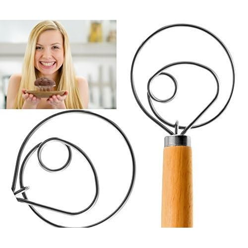• The Premium Original Danish Dough Whisk - Dutch Dough Whisk - Large 13.5" for Better Batter and Bread Dough Recipes - Stainless Steel and Beechwood - Includes Cleaning Brush By LHU is a