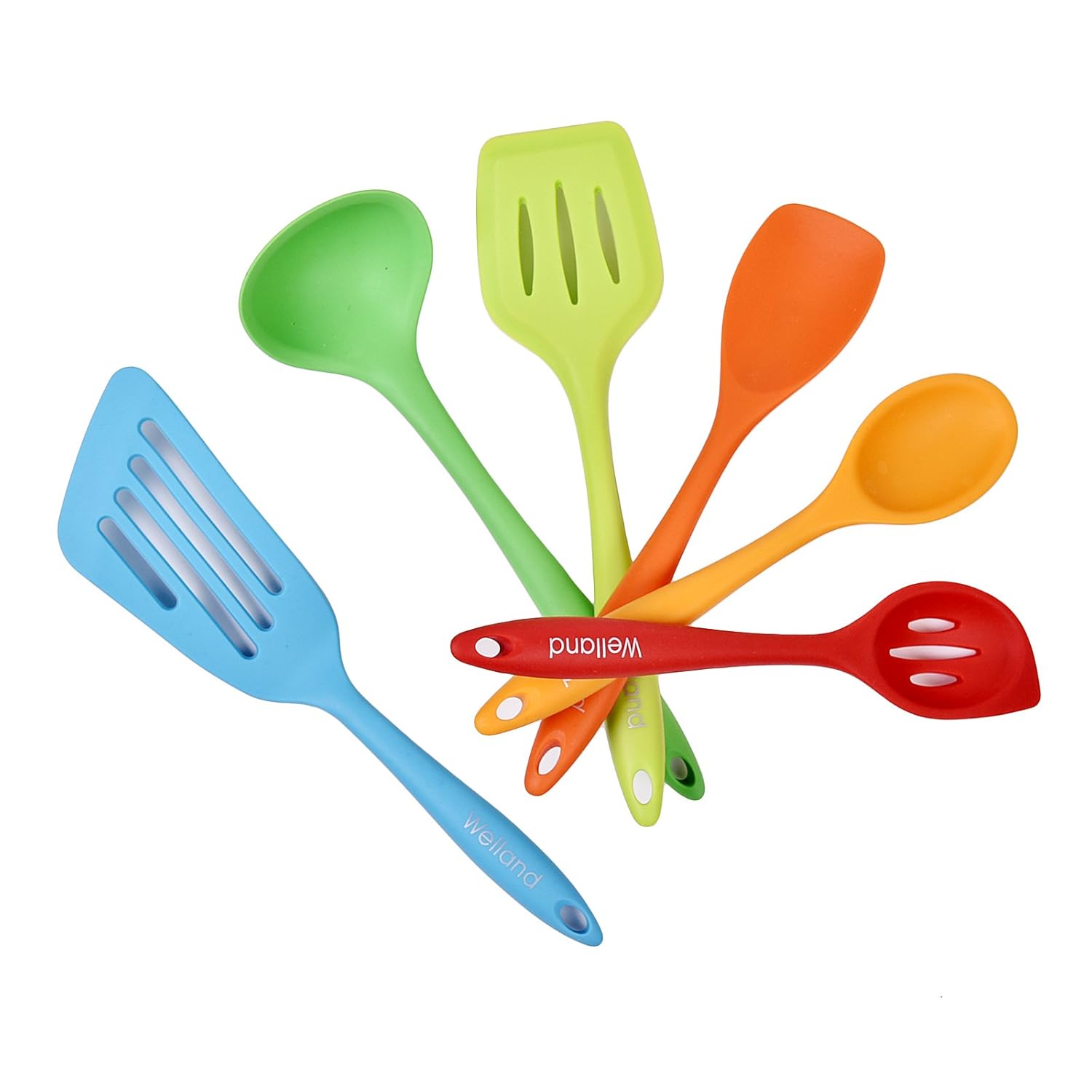 • The WELLAND 6-Piece Silicone Cooking Set - 2 Spoons, 2 Turners, 1 Spoonula / Spatula & 1 Ladle - Heat Resistant Kitchen Utensils, Multicolor is a