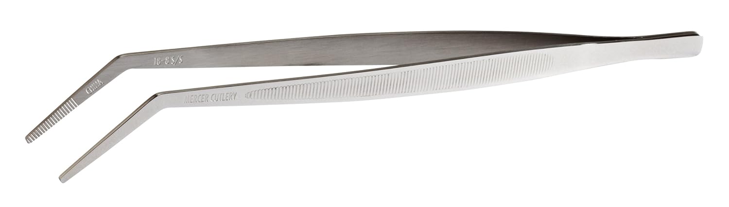 • The Mercer Culinary 18-8 Stainless Steel Precision Tongs, Curved Tip, 9-3/8-Inch is a
