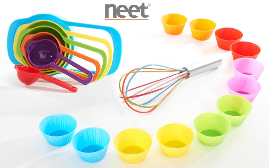 • The Neet® 19-piece Ultimate Rainbow Silicone Baking Set - 12 Silicone Liners, 6 Measuring Cups & Whisk Bundle (Reusable Molds for Hundreds of Uses, Unique Colorful Set) is a